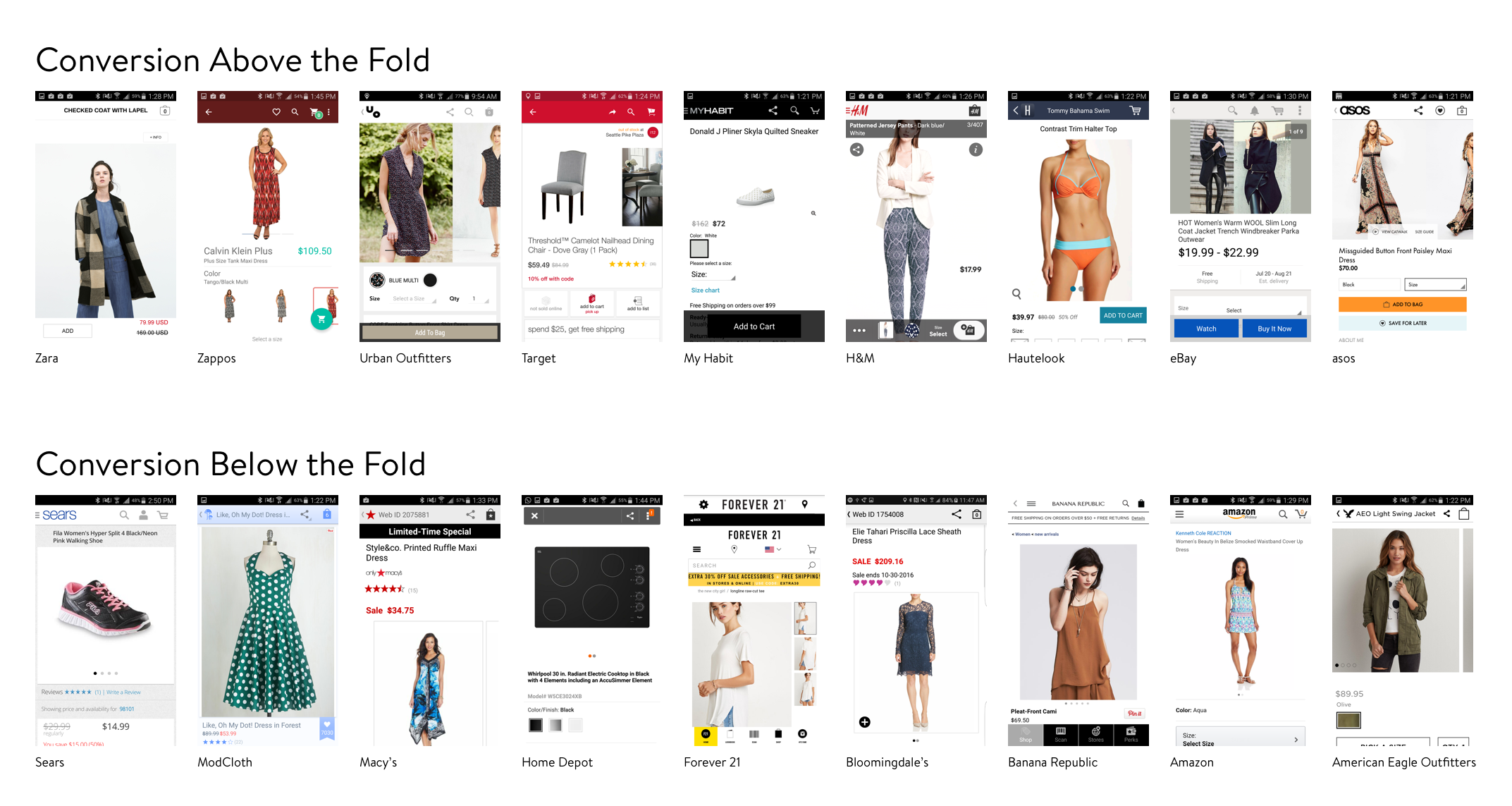 I conducted a competitive analysis on 18 other retail app product pages and discovered that while half of them maintained an "Add to Bag" type button above the fold, the other half did not. I used these results to convince the business team to let go of the idea of placing the majority of their key components above the fold and to let more content flow down the page.
