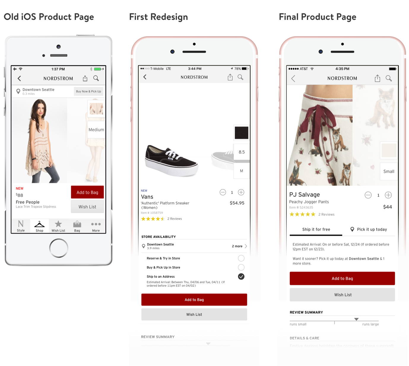 In preparation for a new store service coming to the Nordstrom App, Reserve & Try in Store, I redesigned the apps' product pages to scale beyond the single Buy Online & Pick Up in Store service in the original design.
